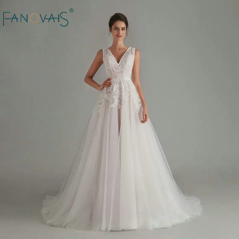 Elegant Boho Wedding Dress 2020 V-Neck Sleeveless Backless Bride Dress Long vestido de noiva robe d