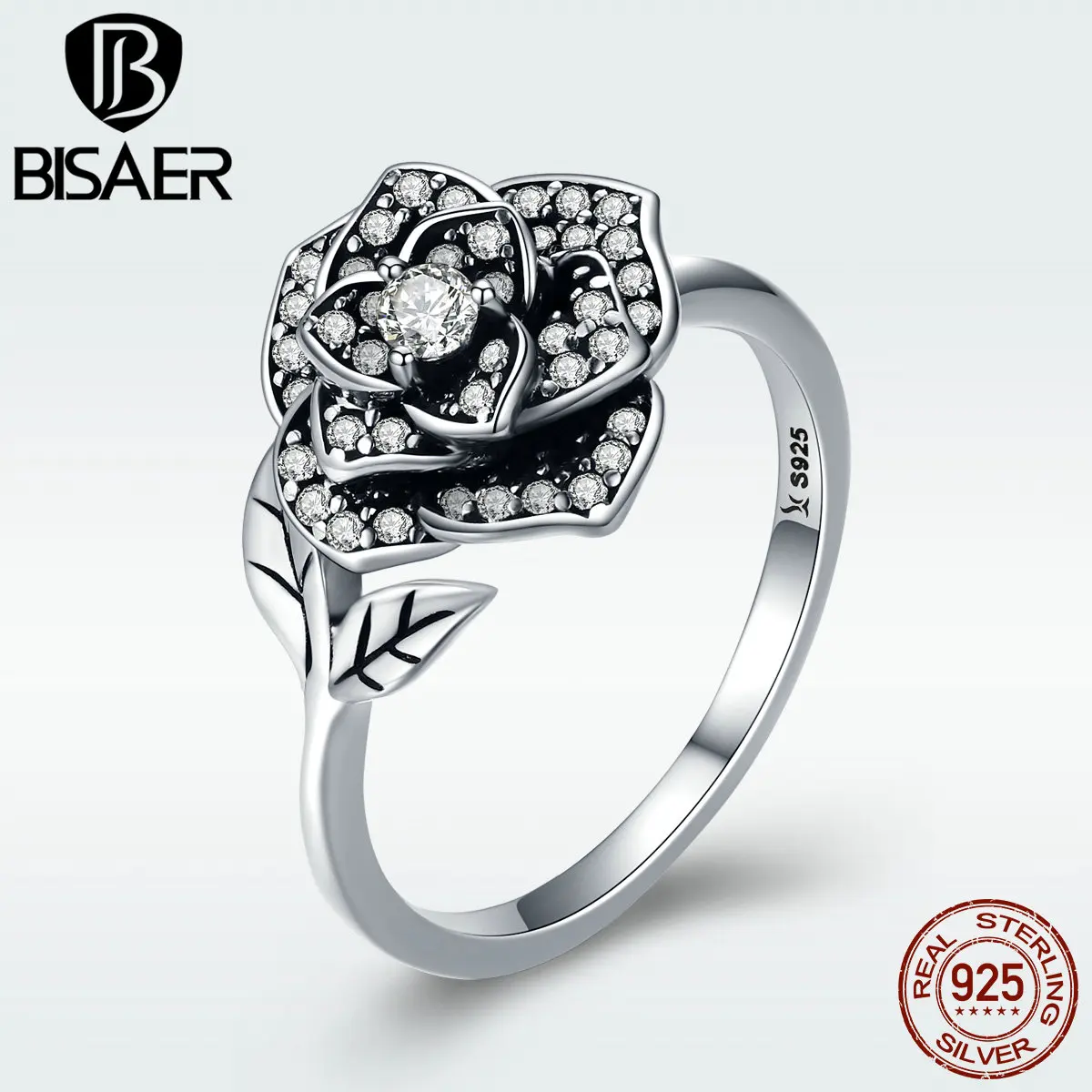 BEST QUALITY 925 Sterling Silver 3D Vivid Clear CZ Crystal Rose Flower and Leaves Open Finger Ring for Women Sty